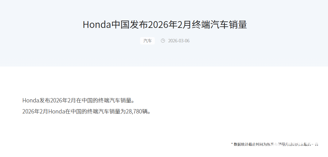 PChome 3月6日消息,本田中国官方发布2月终端销量数据,当月公司在华终端汽车销量为28780辆,较2025年同期的33866辆同比下滑约15%。受2月春节假期影响,当月销售周期缩短,一定程度上削弱了同比数据的可比性。