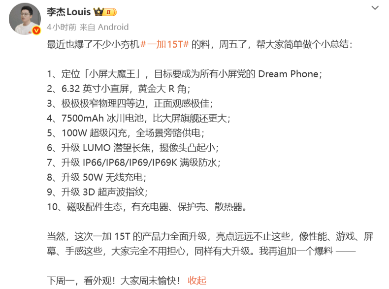 对此,李杰表示,这次一加 15T 的产品力全面升级,亮点远远不止这些,像性能、游戏、屏幕、手感等。小屏党普遍认为该机解决了“性能妥协、续航焦虑、长焦缺失”三大痛点。