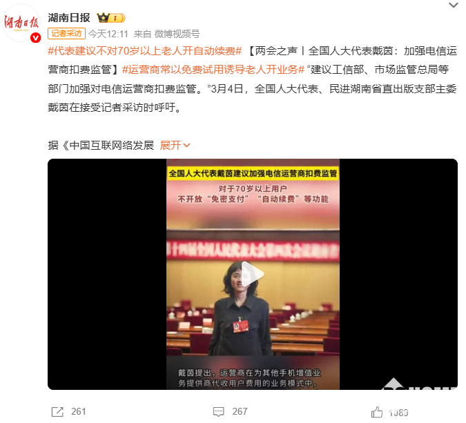 在电信运营商扣费监管方面,戴茵呼吁工信部、市场监管总局等部门加强监管,督促运营商强化内部套餐管理,并规范与第三方的合作销售行为;若因诱导开通、扣款导致老年用户话费损失的,电信运营商应先行垫付赔偿,再向合作方追偿。