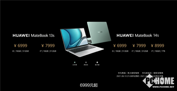 价格方面,MateBook 13s i5/16GB/512GB定价6999元,i7/16GB/512GB定价7999元,MateBook 14s i5/16GB/512GB定价6999元,i7/16GB/512GB定价7999元,i7/16GB/1TB定价8999元,可选云杉绿、深空灰、皓月银三色,9月13日21:08开启预约,9月25日0点同步开售。