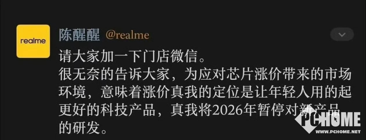 据了解,ID为“陈醒醒”的realme工作人员在公告中表示,很无奈地告诉大家,为应对芯片涨价带来的市场环境,真我将在2026年暂停对新产品的研发。对此,“小马甲不小”点评称:内存涨价,真我国内份额本来就不高,可以理解中国市场暂时停一下。海外市场新品估计不受影响。