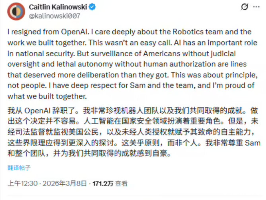PChome 3月7日消息,OpenAI硬件与机器人负责人凯特琳·卡利诺夫斯基于今日宣布辞职,公开抗议公司与五角大楼仓促达成AI军事合作协议,批评其未充分讨论“国内监控”和“致命自主武器”等伦理红线问题。