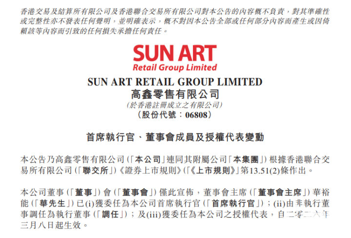 PChome 3月9日消息,大润发母公司高鑫零售于昨日晚间发布公告,因李卫平至今无法联络,长期未请假、未能履行职责,免去其执行董事、CEO及授权代表职务,由董事会主席华裕能接任CEO并调任执行董事,即时生效。