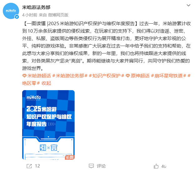 PChome 3月9日消息,米哈游法务部发布2025年知识产权保护与维权年度报告。报告显示,过去一年米哈游累计收到10万余条玩家提供的侵权线索,持续对造谣、泄密、外挂、私服、盗版周边等行为开展精准打击。