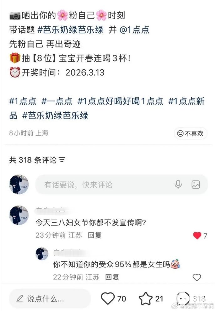 PChome 3月10日消息,前几日3月8日国际劳动妇女节,因奶茶品牌一点点官方账号未发布任何节日祝福、海报或营销活动,与往年积极营销形成巨大反差,引发大量女性消费者强烈不满。