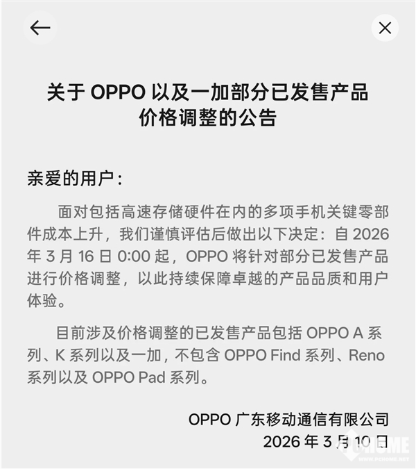 PChome 3月10日消息,OPPO官方发布价格调整公告,宣布将于3月16日起,对旗下部分已发售机型进行调价,包括A系列、K系列及一加在售机型,Find系列、Reno系列与平板产品暂不调整。
