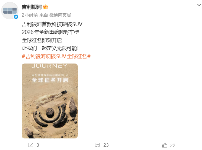 PChome 3月10日消息,吉利银河正式官宣旗下首款科技硬核SUV,定位全新硬派越野车型,并同步启动全球征名活动。