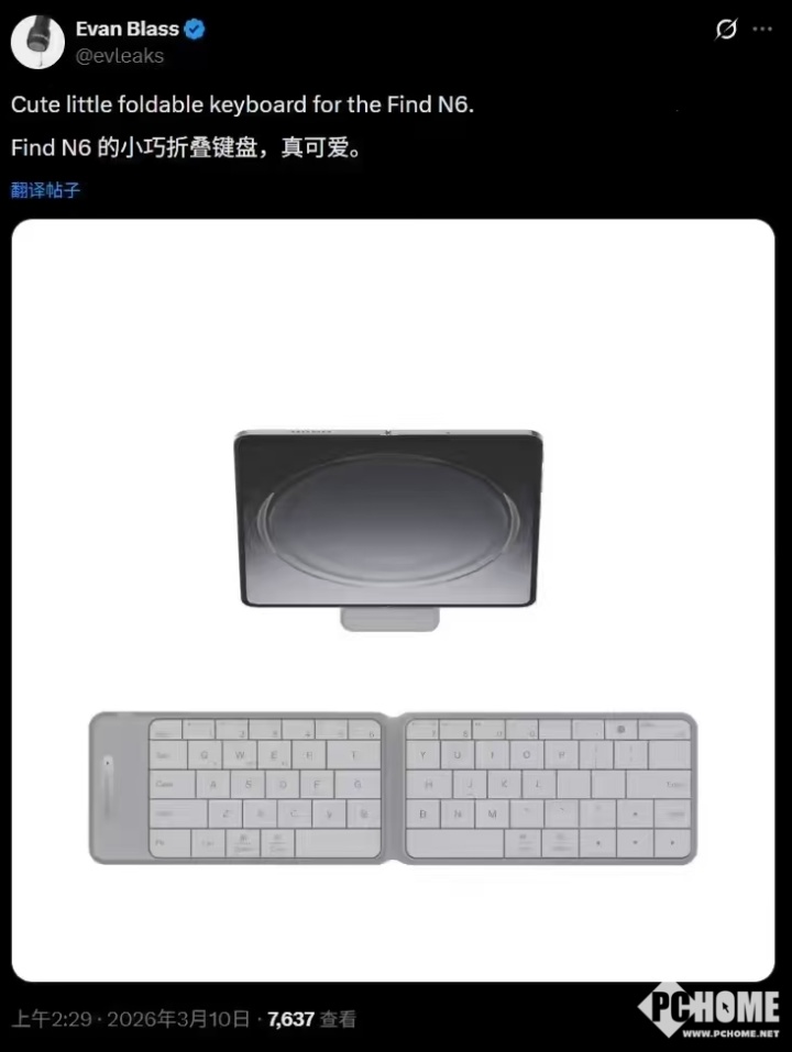 PChome 3月10日消息,博主@evleaks今日在X平台曝光了OPPO即将发布的折叠屏旗舰Find N6的专属折叠键盘配件。