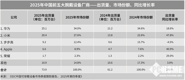 PChome 3月10日消息, 近日,IDC发布最新《中国可穿戴设备市场季度跟踪报告》,2025年中国腕戴设备市场出货量达7390万台,同比增长20.8%。其中,华为以2510万台的出货量、34%的市场份额,位列市场第一。