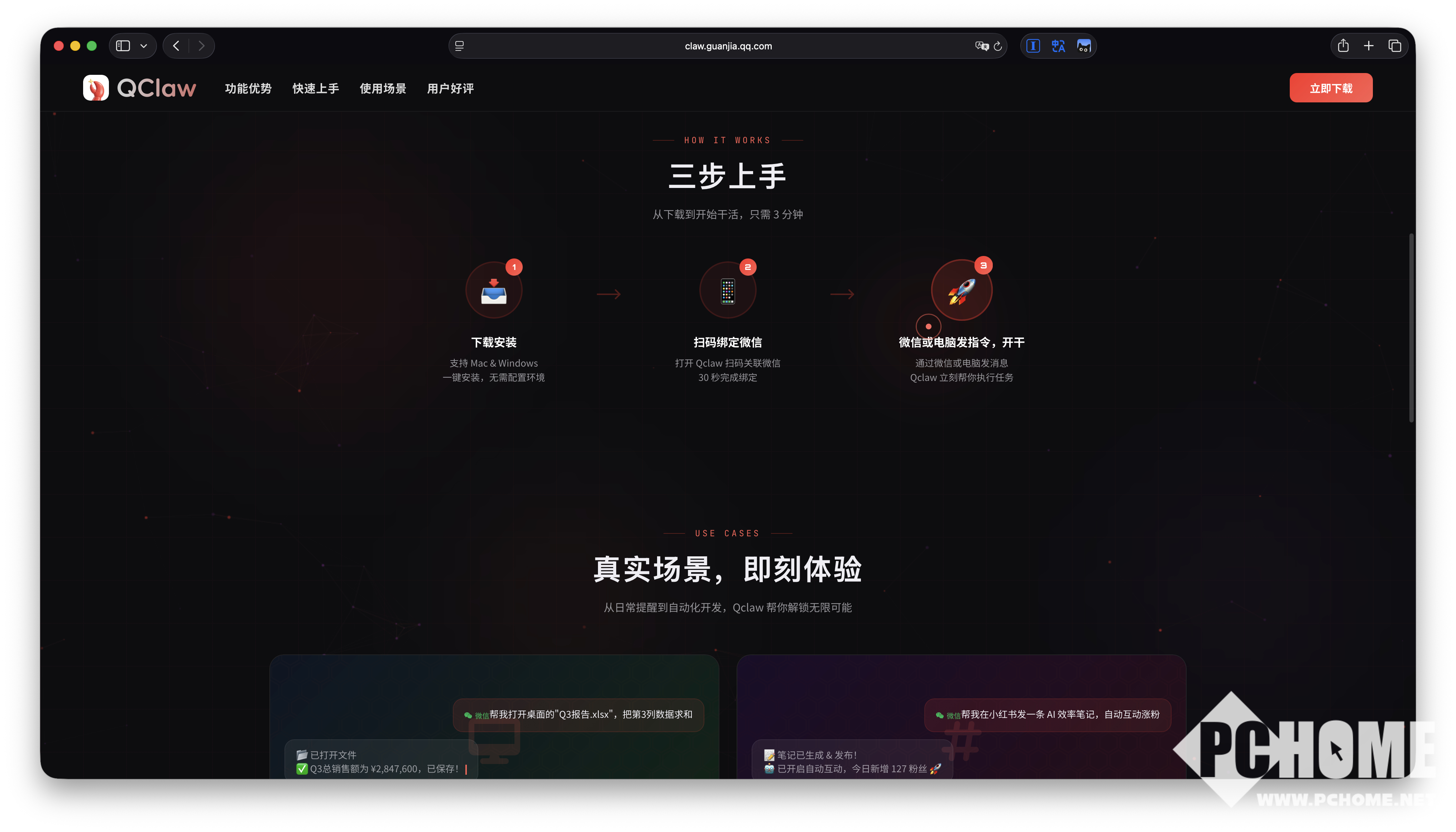 据PChome了解,QClaw支持扫码绑定微信,用户通过微信聊天窗口发送指令,AI自动操作电脑完成任务,结果通过微信直接返回,即使未携带电脑,也能处理文件、数据计算等复杂操作。并且提供Windows/Mac安装包,自动关联本机已有OpenClaw实例,30秒完成微信绑定,实现一键部署。
