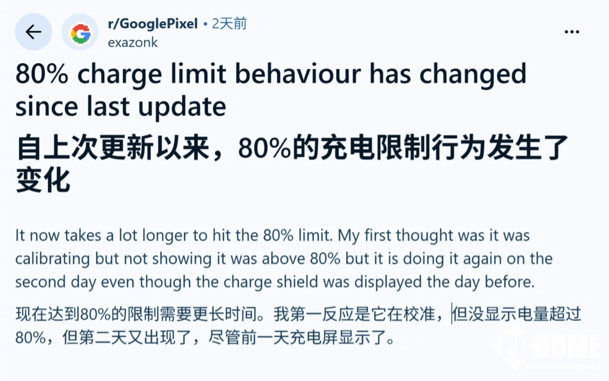 据PChome了解,在2026年3月的系统更新后,用户发现Pixel 10a等机型启用“80%充电限制”功能时,电量达到76%-77%后充电速度明显变慢,最后3%-4%的电量补充耗时显著延长。最初许多用户误以为是系统故障,但谷歌官方在IssueTracker平台明确回应,这是有意为之的设计优化,而非漏洞,设备在约77%电量时自动切换至低电流模式,以减少高电压对电池的损耗,从而提升长期耐用性。