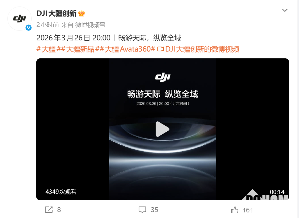 PChome 3月10日消息,大疆创新官方正式宣布,新品发布会定档3月26日20:00举行,宣传语为“畅游天际,纵览全域”,将面向全球用户线上直播,此次发布会核心看点为传闻已久的大疆首款全景无人机Avata 360,引发数码及航拍爱好者广泛关注。