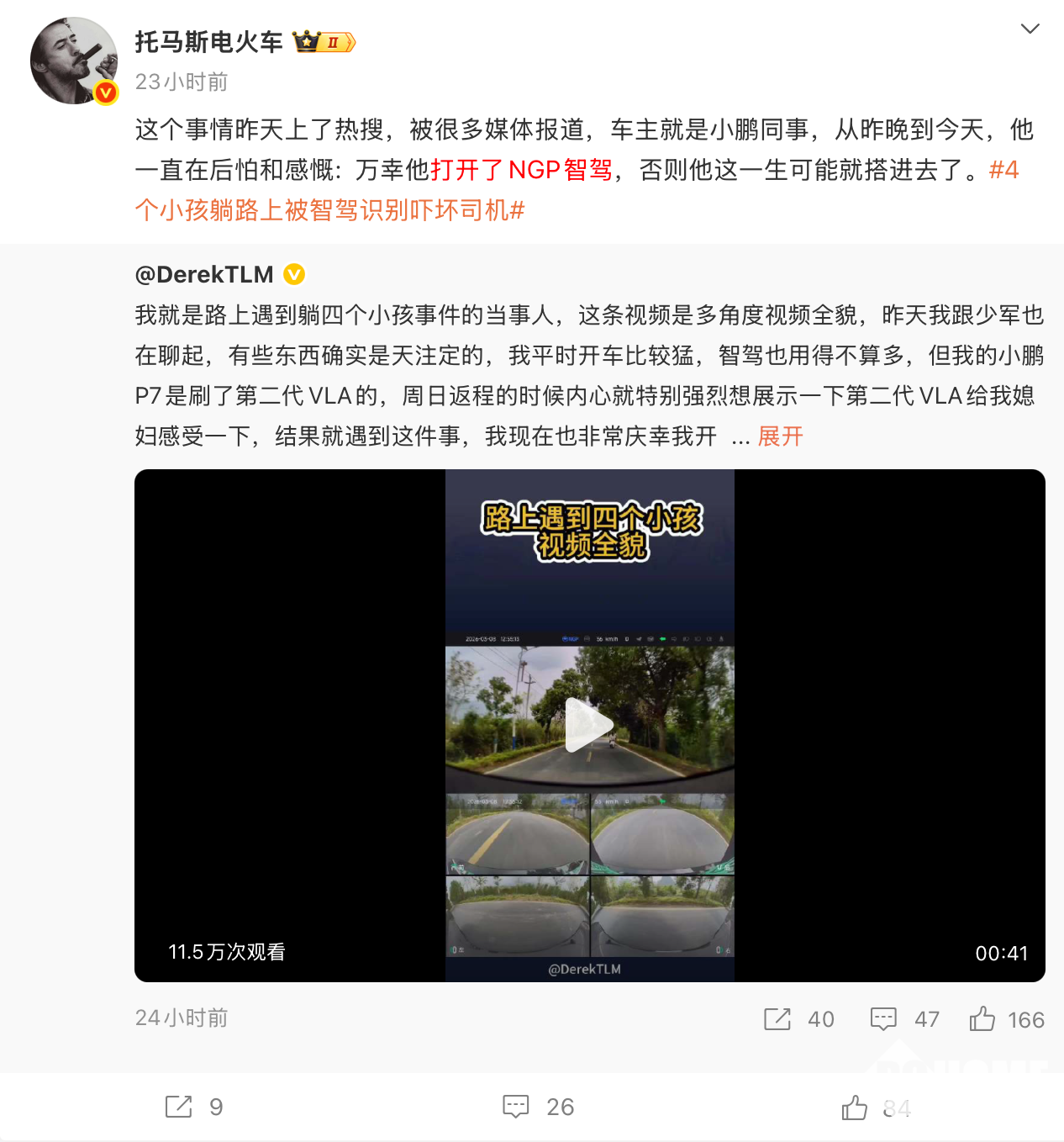 3月10日,小鹏汽车副总裁“托马斯电火车”就此事作出回应,透露涉事车主实为小鹏内部员工,事发后一直处于后怕中,“万幸他打开了NGP智驾,否则他这一生可能就搭进去了”。同时,该高管也强调,相比智驾技术的助力,更值得反思的是儿童安全问题,呼吁家长务必履行监护责任,教会孩子分辨危险。