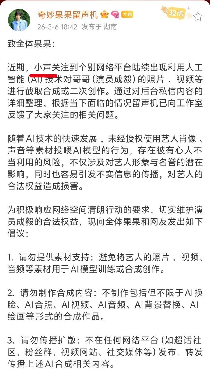 PChome获悉,此前,网络上泛滥的AI换脸、虚拟形象、声音克隆等内容,存在恶意篡改、造谣及商用侵权风险,引发众多艺人粉丝群体强烈反对。3月6日,成毅粉丝组织“奇妙果果留声机”发布倡议,明确禁止制作、传播未经授权的AI合成内容,严禁将其肖像、声音用于AI模型训练,呼吁粉丝共同维护艺人的合法权益。工作室据此启动法律程序,4天内推动平台落实限制。