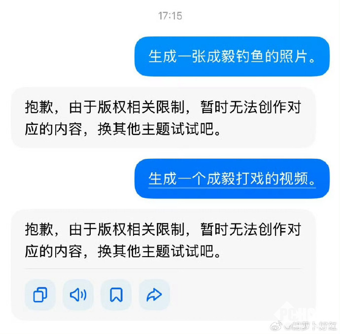 据用户实测,在豆包、千问等平台输入“生成成毅图片”“生成傅诗淇唱歌图片”等包含其姓名或艺名的指令时,系统会统一返回“版权限制无法创作”等的类似回复,限制范围覆盖图片、音频、视频等多种合成形式。