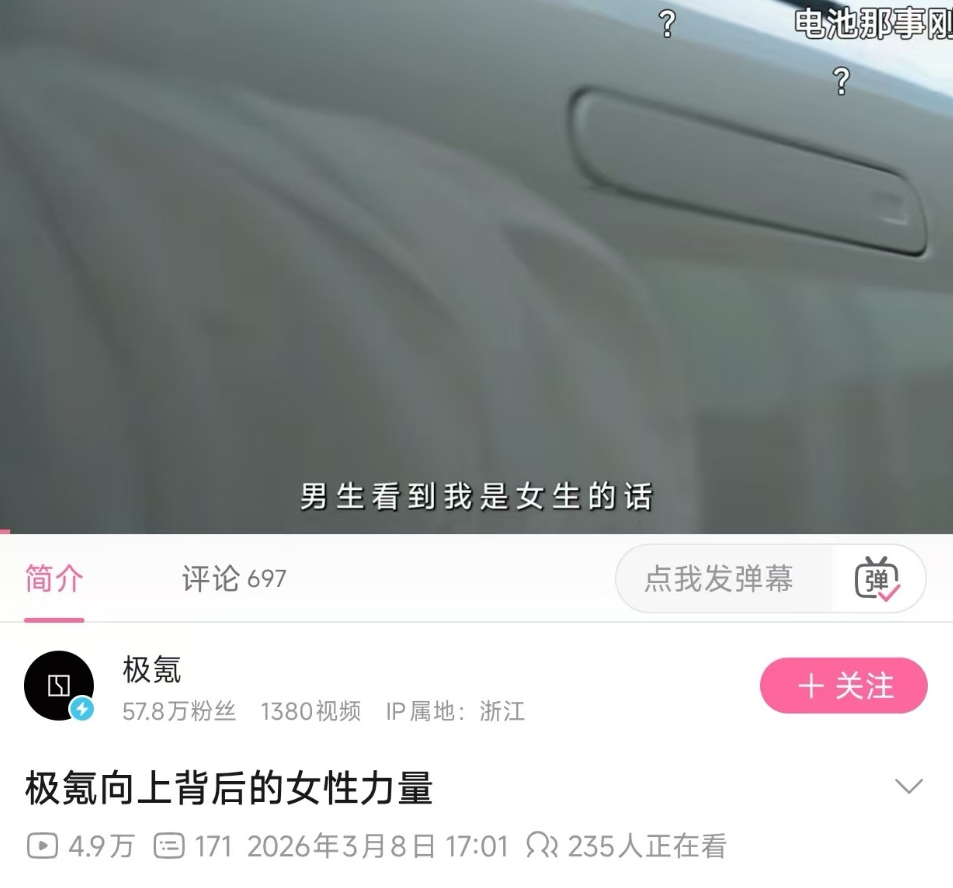 PChome获悉,视频中,极氪女性工程师提及“汽车行业女性普遍较少,每天上班电梯里都是男性”,并类比电影《飞驰人生》“一个女性角色都没有”,强调行业由男性主导的传统现象。多数观点认为,此类表述非但未突出女性专业价值,反而强化了性别刻板印象,被批“制造性别对立”和“猎奇女性身份”。