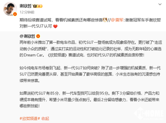 谢欣哲表示,初代小米SU7他打85分,而新一代车型凭借产品力与硬成本的双重提升,愿意给到95分的高分。他直言新车不仅进一步增强了机械素质,还打造了豪华高级氛围,同时他提出,希望小米能平衡成本,降低购买门槛,让更多人能够体验到新车的技术实力。这一评价迅速传播,小米高管潘九堂随即转发认同,雷军也公开致谢其对新一代SU7的认可。