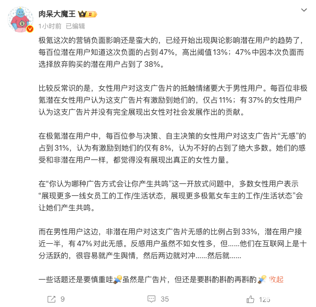 近日,极氪为三八妇女节推出的宣传视频《拒绝坐副驾的女人们》引发广泛争议,上线仅两天便全网下架。微博博主“肉呆大魔王”发布分析指出,此次营销已对品牌潜在用户产生显著负面影响。