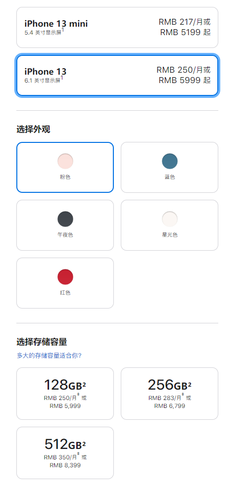 对比上代,iPhone 13 mini、iPhone 13起步容量翻了一番直接128GB,起步价都降低了300元,中间档不变,高配则贵了800元之多。