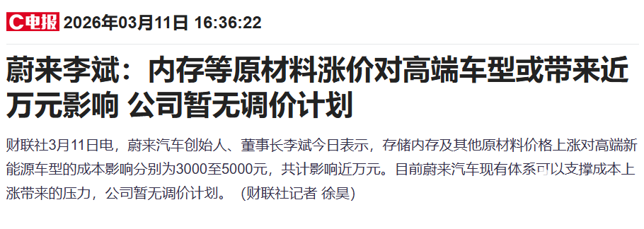 PChome 3月11日消息,据财联社报道,蔚来汽车创始人、董事长李斌今日表示,受车规级内存芯片及碳酸锂、铜等其他原材料价格上涨影响,对蔚来高端车型带来3000-5000元成本抬升,合计增加近万元。但他也明确道,公司当前现有体系可支撑成本压力,暂无车型调价计划。