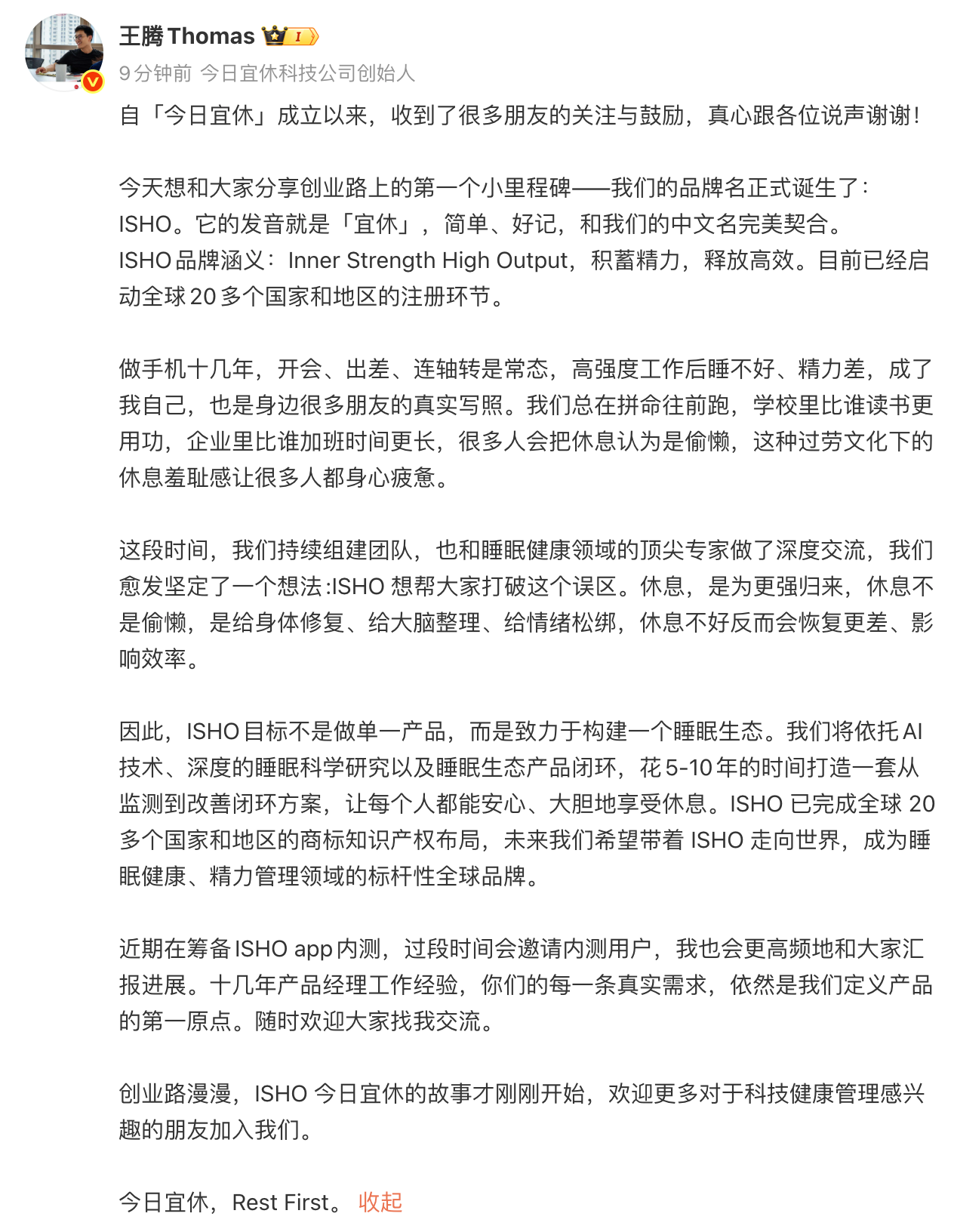 前小米高管、Redmi品牌发言人王腾今日通过微博正式公布其创业项目“今日宜休”的品牌英文名——ISHO。该品牌发音即为“宜休”,寓意“Inner Strength High Output”(积蓄精力,释放高效)。