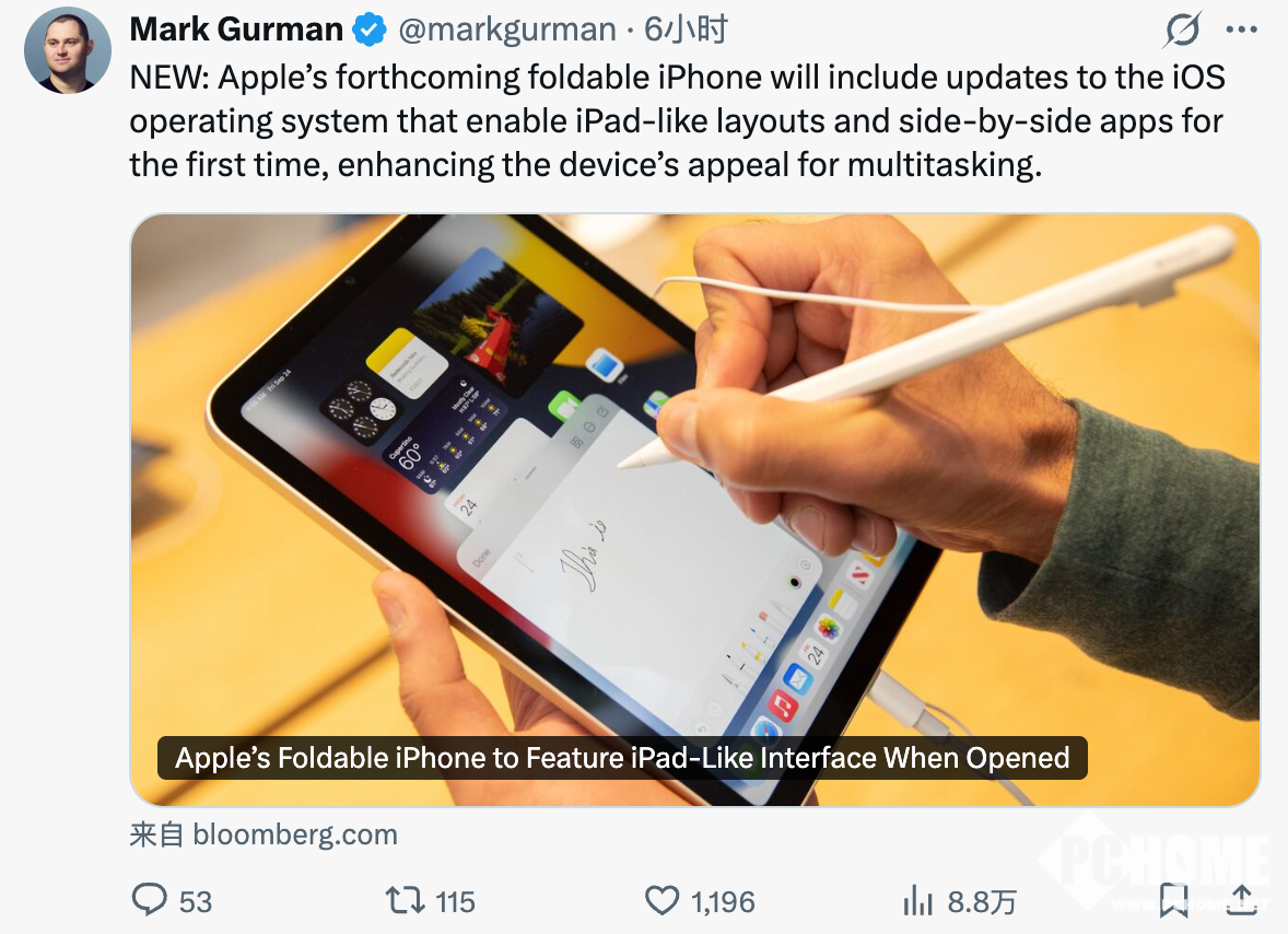 系统与生态方面,苹果为折叠屏做了针对性优化。iPhone Fold预装应用会根据大屏展开状态重新适配,力求在展开后提供接近iPad的使用体验。但马克·古尔曼强调,这并不意味着设备可直接运行iPad专属应用,二者生态仍保持独立,用户无法简单移植平板端软件。