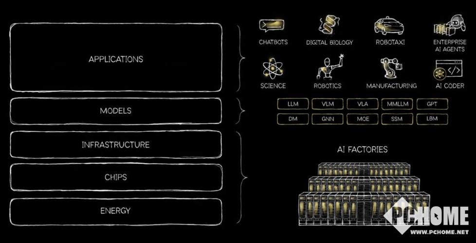 在这篇题为《AI是一块五层蛋糕》的文章中,黄仁勋将AI产业划分为五个相互支撑的层级:最底层的能源、之上的芯片、基础设施、模型,以及最顶层的应用。他强调,AI并非单一的应用程序或模型,而是如同电力和互联网一样至关重要的基础设施,运行在真实的硬件、能源和经济基础之上。