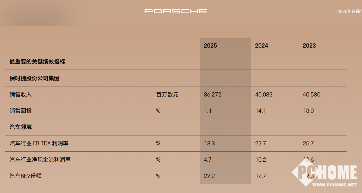 PChome 3月12日消息,保时捷于昨日正式发布2025财年财报,全年营业收入362.7亿欧元,同比下滑9.5%;销售利润从2024年的56.4亿欧元骤降至4.13亿欧元,同比暴跌92.7%,销售回报率仅1.1%,远低于上年14.1%水平,核心盈利指标均大幅下滑。