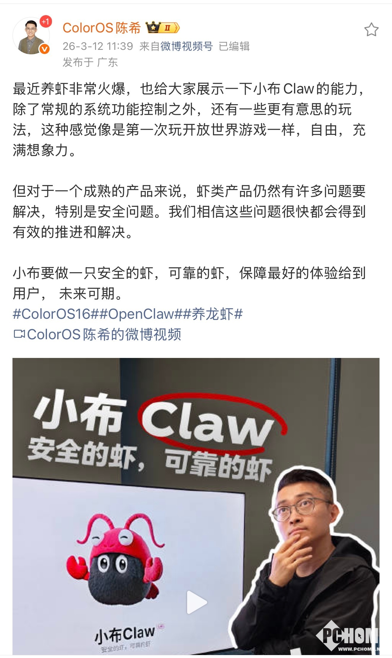 PChome 3月12日消息,今日,OPPO软件工程副总裁陈希首次公开展示了ColorOS系统深度整合的AI智能体“小布Claw”。