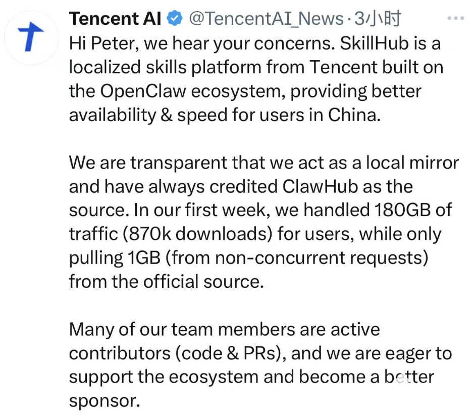 PChome获悉,OpenClaw创始人Peter Steinberger在社交平台指出,腾讯SkillHub未经沟通直接抓取ClawHub平台全部技能数据,导致其服务器单周成本飙升至五位数美元,更令他不满的是收到腾讯团队邮件,抱怨OpenClaw的速率限制影响抓取效率,却未提供任何成本支持或合作协商。Peter Steinberger强调腾讯行为虽符合开源协议,但违背了开源协作精神:“本可提前沟通合作,共建官方认证镜像,但他们从未联系我”。