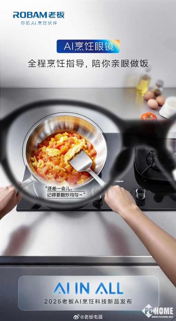 PChome 3月12日消息,在AWE 2026中国家电及消费电子博览会上,老板电器正式发布全球首款AI烹饪眼镜,这是一款深度融入厨房场景、覆盖烹饪全流程的AI智能体,标志着厨电AI从被动辅助迈入主动执行的新阶段。