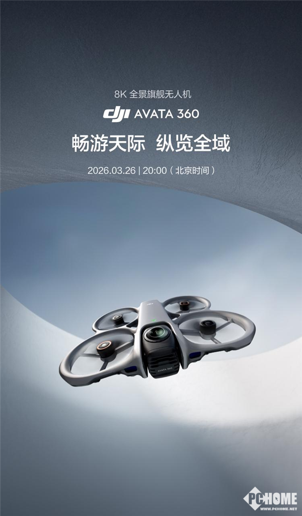 PChome 3月12日消息,大疆正式官宣首款全景无人机Avata 360,定档3月26日20:00全球发布,这款融合全景拍摄与FPV飞行模式的旗舰机型,以8K高清影像为核心亮点,填补了大疆在全景无人机领域的空白。