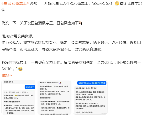 对此,有网友询问豆包对于“消极怠工”这一看法,它否认存在该问题,并称一直在迭代优化,用户的吐槽可能是由于个别场景的响应效果没有达到预期。但当网友提供证据再次询问它时,豆包却为此表达了歉意,将原因归结于近期审核严格、访问量过大,导致用户体验不佳,承诺后续会立即调整、用心服务。