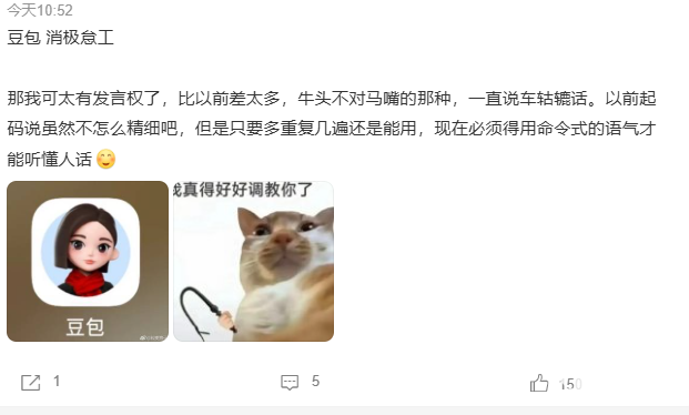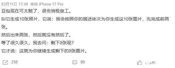 用户反馈,在要求生成多张图片时(如10张),豆包承诺会按照要求依次完成,但生成两张后便停滞,需用户主动追问才能继续完成剩余任务。还有用户表示,豆包的回复经常“牛头不对马嘴”,需要多次重复指令,或使用命令式的语气才能完成任务,与以前的使用体验形成强烈差异。