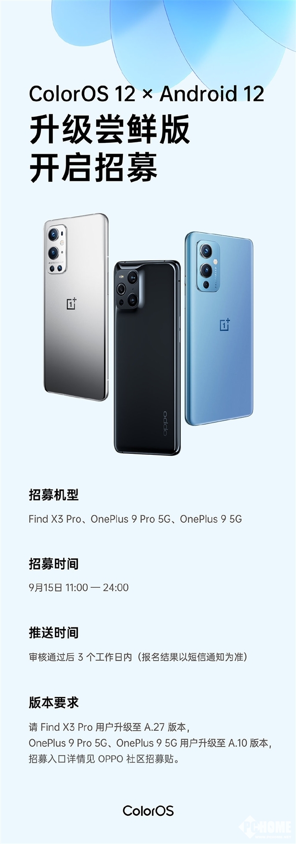 9月16日18点,OPPO将召开秋季新品发布会推出OPPO Find X3 Pro摄影师版,而且这款机型将首发ColorOS 12。今日,官方宣布,ColorOS 12开启尝鲜版招募,一加9、一加9 Pro和OPPO Find X3 Pro等机型可以参与尝鲜,报名申请通过后会在3个工作日内推送更新。