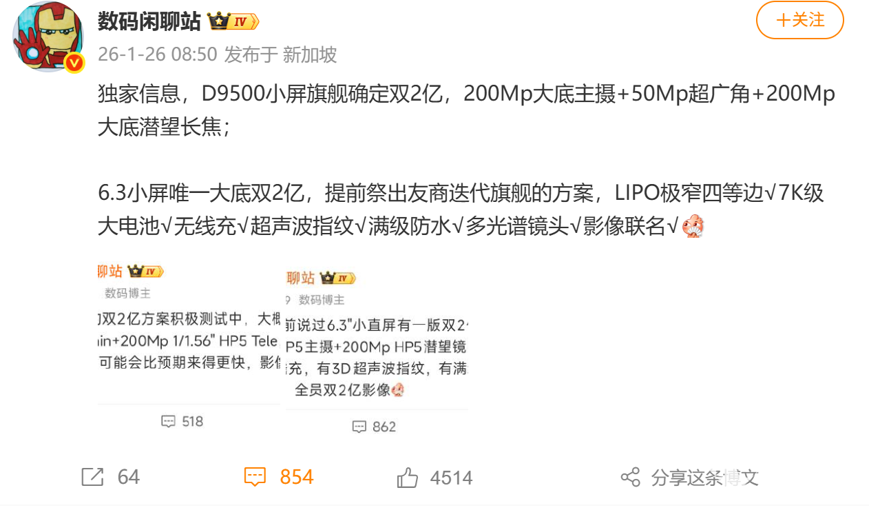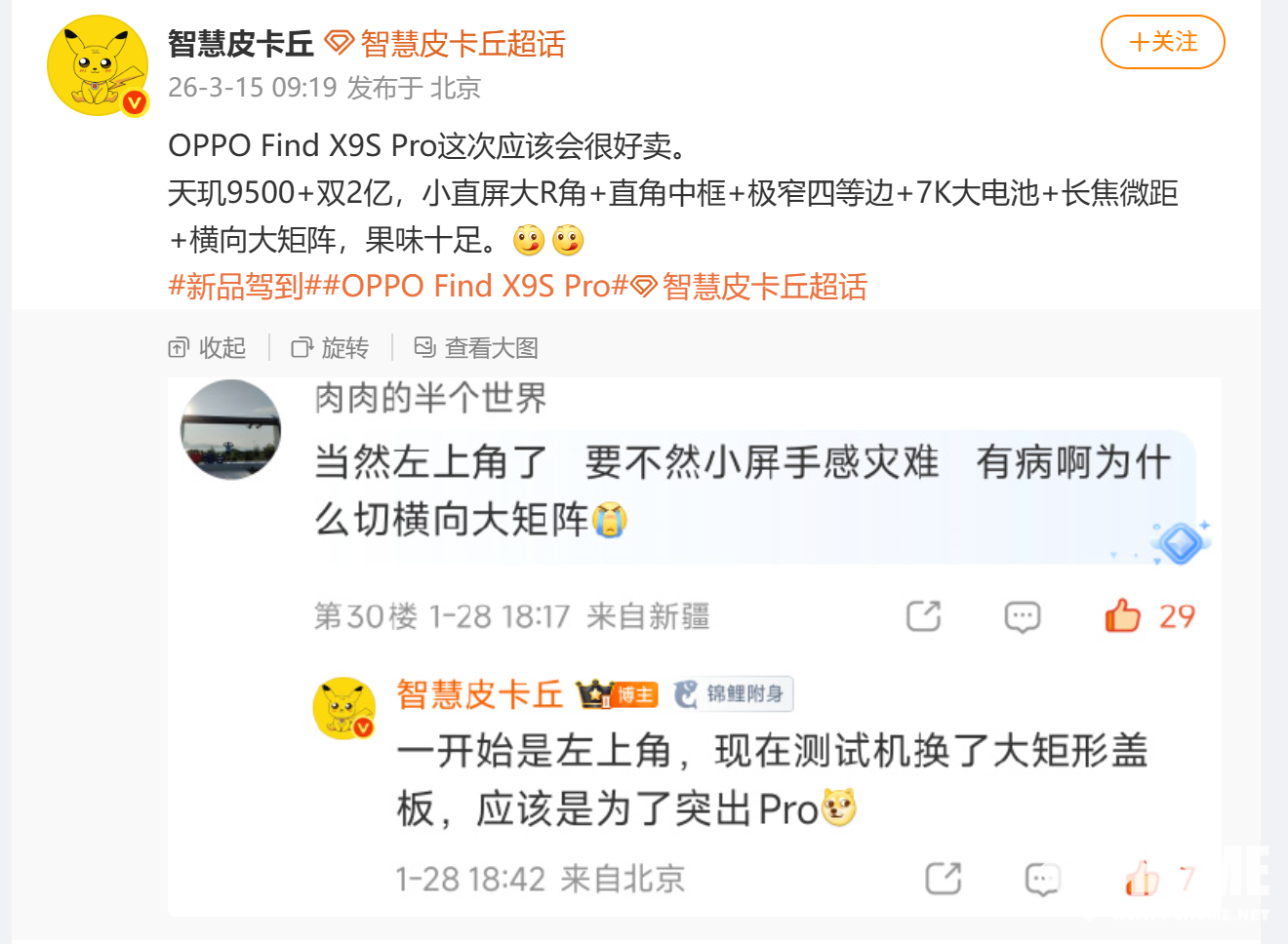 PChome 3月15日消息,博主“智慧皮卡丘”今日发文透露OPPO Find X9s Pro的核心配置,该机定位小屏旗舰,搭载天玑9500+处理器、双2亿像素影像系统与7000mAh超大电池,在轻薄机身内实现性能、影像、续航全面升级。
