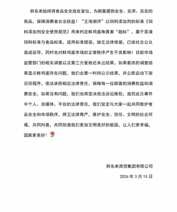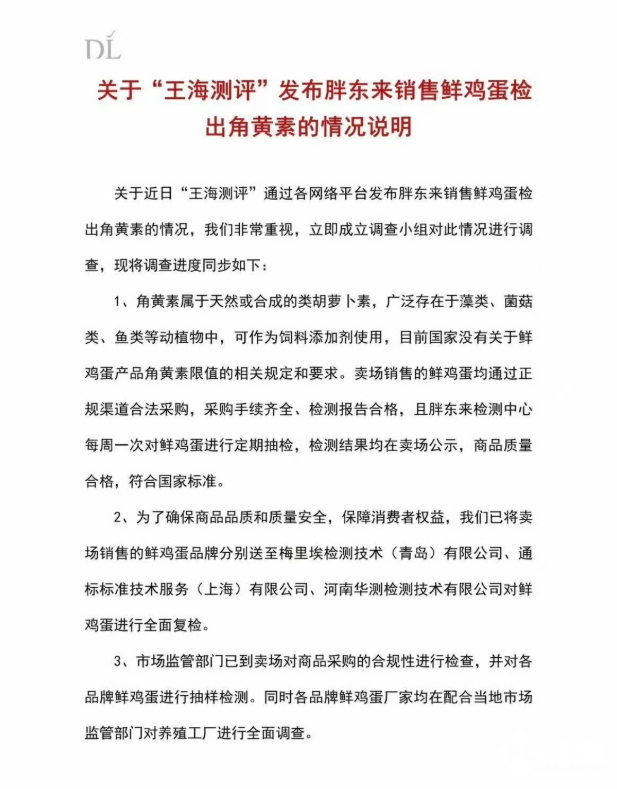 据PChome了解,胖东来针对博主“王海测评”质疑其鸡蛋含人工色素超标一事,于昨日发布声明强硬回应,胖东来指出角黄素作为饲料添加剂,我国目前无鲜鸡蛋残留限值的国家标准,博主用饲料标准判定食品属概念混淆,适用依据错误。同时强调其鸡蛋采购手续齐全、每周抽检公示结果,均符合现行国标,而涉事鸡蛋品牌已送至梅里埃、通标、华测三家第三方机构全面复检,并配合市场监管部门对采购合规性及产品抽样调查。