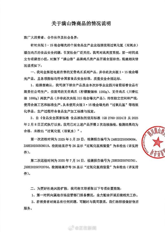 与辉同行客服对《正在新闻》记者回应称,公司高度重视此次食品安全事件,经核查,确认直播间所售满山馋相关商品并非晚会曝光的涉事批次产品。强调公司在选品阶段已严格审核商家资质与检测报告,符合国家食品安全标准。
