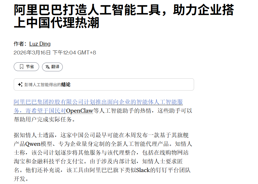 PChome 3月16日消息,据彭博社援引知情人士消息,阿里巴巴计划推出企业级AI智能体产品,由钉钉团队基于通义千问模型打造,最快于本周发布。该产品可自主操作电脑、浏览器与云服务器,未来还将逐步接入淘宝、支付宝等自家服务。