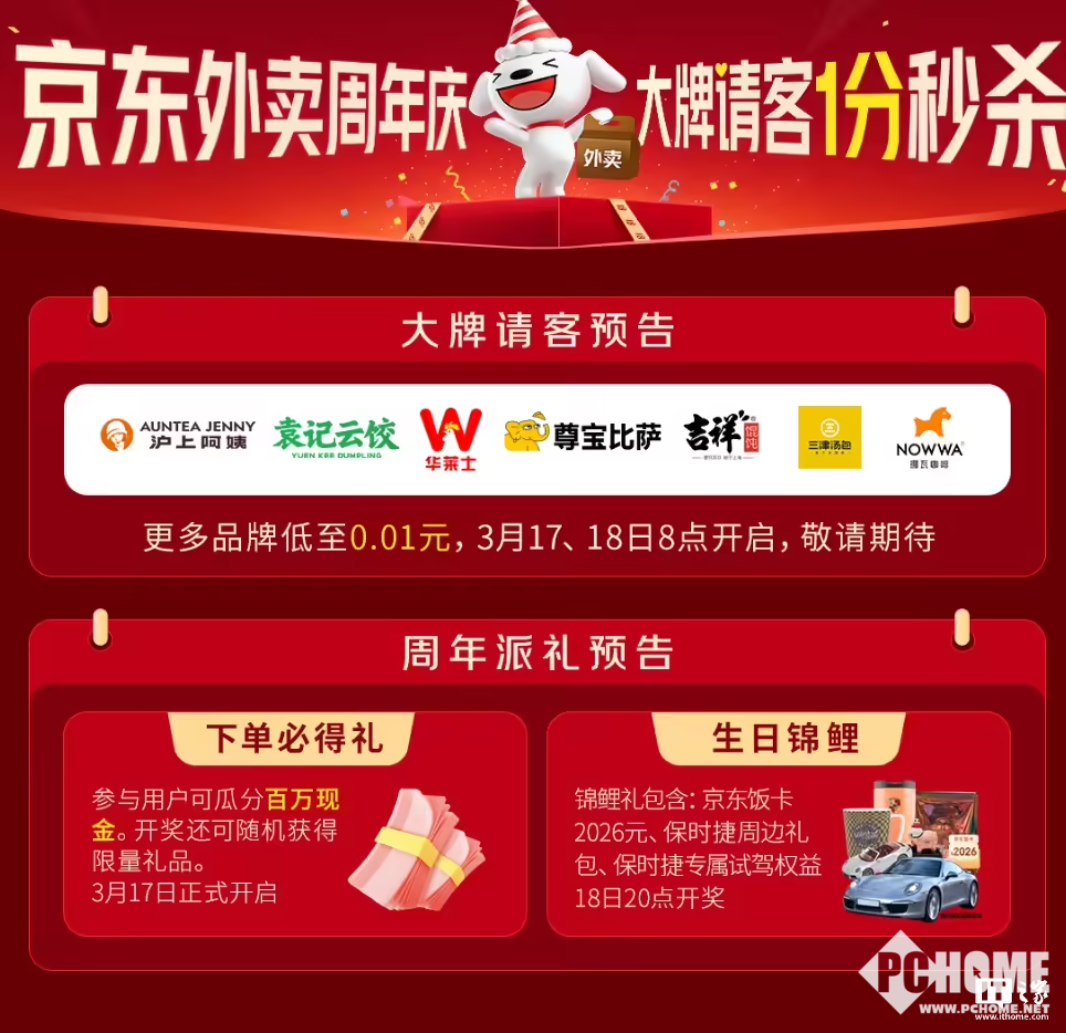 PChome 3月16日消息,京东外卖宣布,将于3月17日-18日每日8点开启周年庆活动,推出“大牌请客”福利,用户可领取1元自提通用券,参与沪上阿姨、袁记云饺、尊宝比萨等品牌1分钱自提秒杀,同步上线多种抽奖权益。