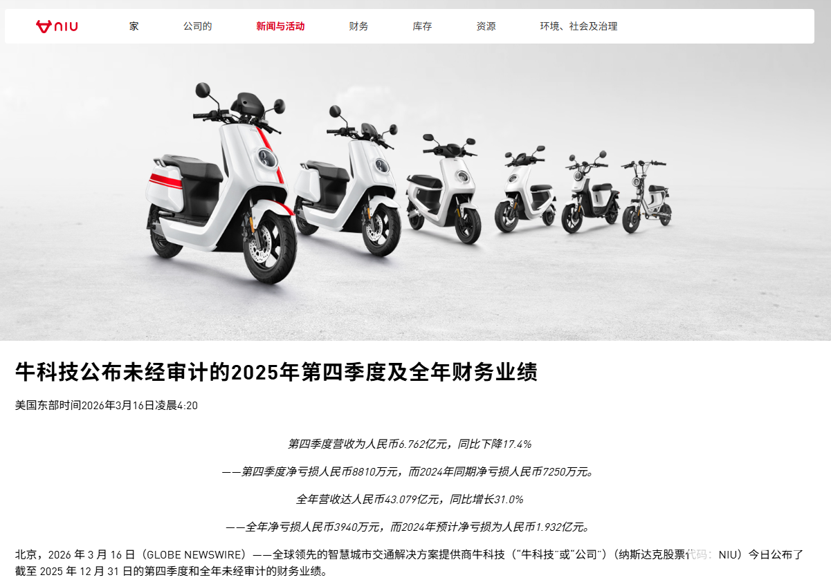 PChome 3月16日消息,小牛电动今日发布2025年第四季度及全年未经审计财务业绩。全年实现营业收入43.079亿元,同比增长31.0%;净亏损3940万元,较2024年1.932亿元大幅收窄,盈利情况显著改善。