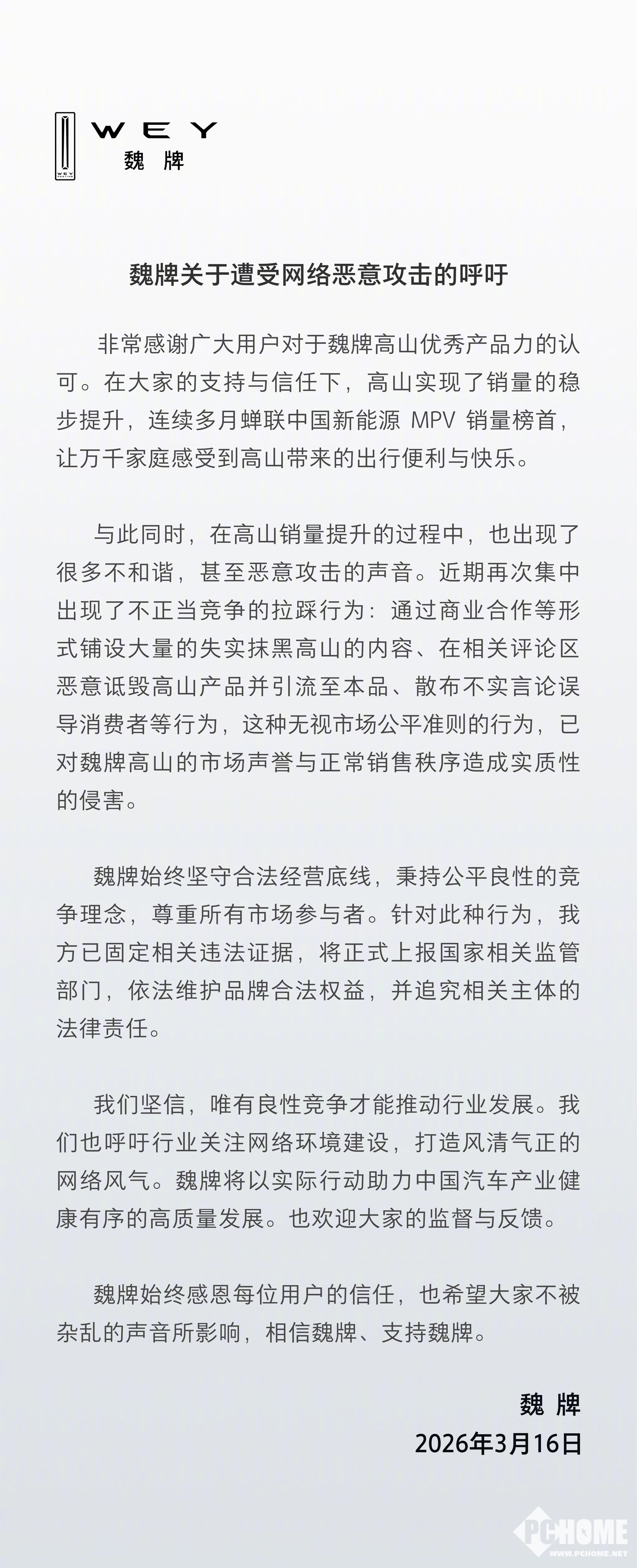 PChome 3月16日消息,长城魏牌于今日发布声明,称旗下高山MPV在销量提升过程中遭遇有组织的网络恶意攻击。