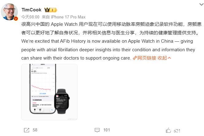 PChome 3月17日消息,苹果CEO库克宣布Apple Watch“移动脉率房颤迹象记录软件”功能面向中国大陆用户全面上线,该功能专为22岁及以上已确诊房颤患者设计,已获得中国国家药品监督管理局批准,取得进口医疗器械第二类资质。