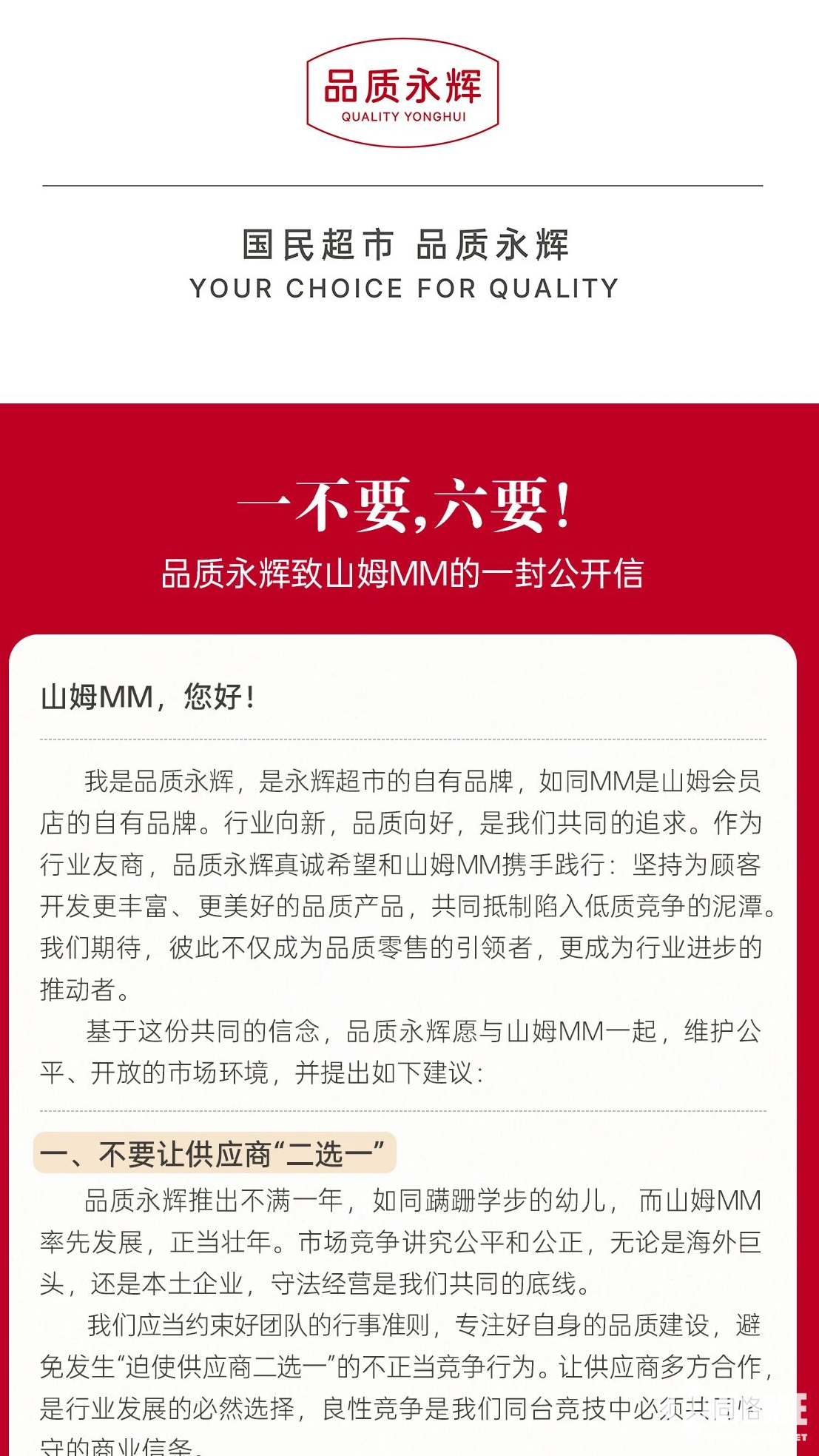PChome 3月17日消息,永辉超市旗下自有品牌“品质永辉”今日发布致山姆会员店自有品牌Member’s Mark的公开信,指控山姆利用渠道优势“迫使供应商二选一”,呼吁停止不正当竞争行为。