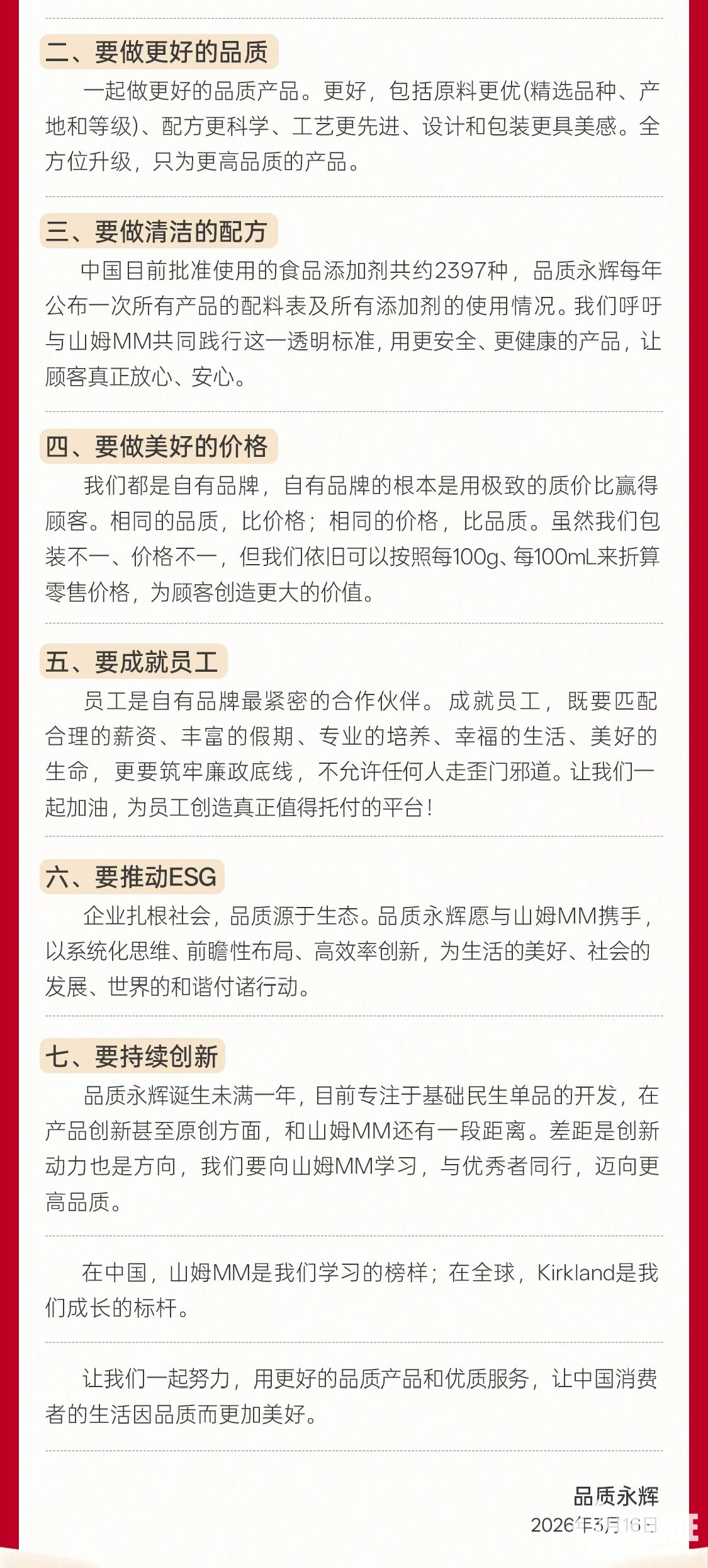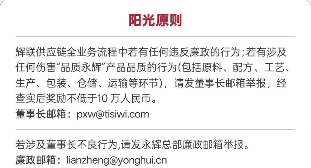 信中同时提出的“六要”倡议,包括做更好的品质、清洁的配方、美好的价格,成就员工、推动ESG、持续创新,呼吁共同践行透明化经营模式,让消费者体验到更好的产品及更优质的服务。此外,品质永辉还公布“阳光原则”及廉洁举报渠道,强调零供合作的合规与透明。