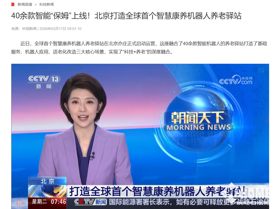 PChome 3月17日消息,据《央视新闻》今日报道,全球首个智慧康养机器人养老驿站在北京亦庄正式运营,同步挂牌“北京市居家适老化改造公共样板间”,实现了“科技+养老”的深度融合。