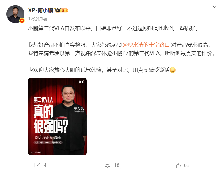 PChome 3月17日消息,何小鹏主动邀请以“挑剔”闻名的罗永浩深度体验小鹏第二代VLA自动驾驶系统,而罗永浩用“刚切了胆囊没胆了但性格依旧龟毛”的自嘲式回应引发了网友热议。