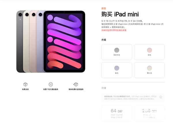 昨日凌晨,第六代iPad mini正式发布,这是目前为止升级变化最大的一款mini平板。今日上午9点,iPad mini 6已经在苹果中国官网开启了预售,将于9月24日(下周五)正式发售。需要注意的是,每位顾客限购2部iPad mini(无线局域网机型)和2部iPad mini(无线局域网+蜂窝网络机型)。