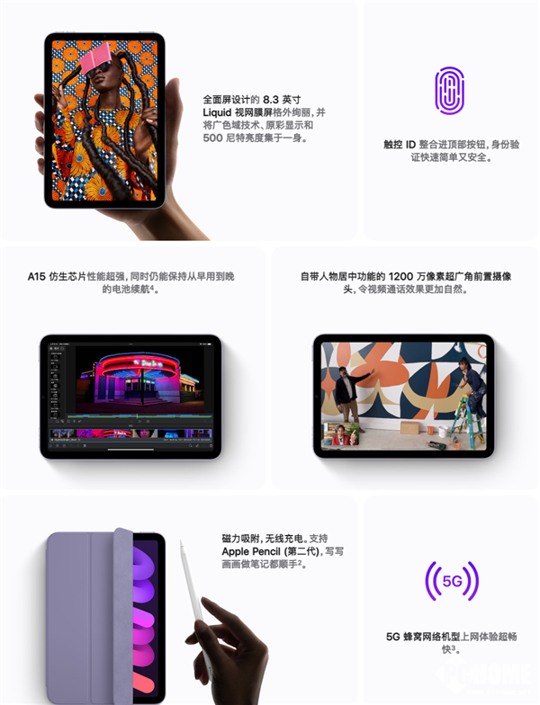另外,iPad mini 6最为明显的改进就是外观方面,其整体引入了iPad Air 4的设计语言,首次采用全面屏方案,正面配备一块8.3 英寸Liquid 视网膜显示屏,分辨率为2266x1488,326 ppi,并且支持原彩显示、Apple Pencil二代。