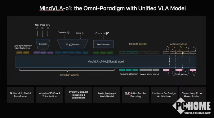 PChome获悉,MindVLA-o1模型基于统一Omni架构打造,采用原生多模态MoE Transformer,在单一Transformer 中实现建模感知、推理与控制的深度融合。模型搭载3D空间理解模块,通过3D编码器让车能够像人类一样感知物体的深浅、距离和运动状态,真正理解三维物理空间。